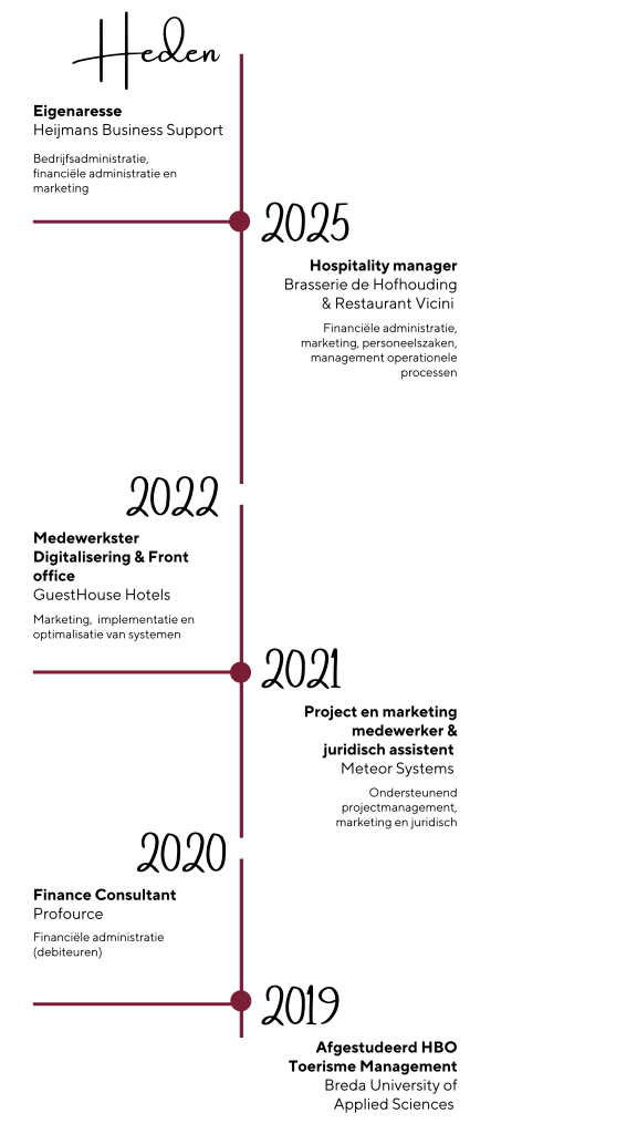 Na mijn studie heb ik uitgebreide kennis en ervaring opgedaan op het gebied van financiën, marketing en bedrijfsadministratie in diverse systemen. Met deze expertise adviseer en ondersteun ik ondernemers en zzp’ers om hun bedrijf efficiënter en succesvoller te organiseren.